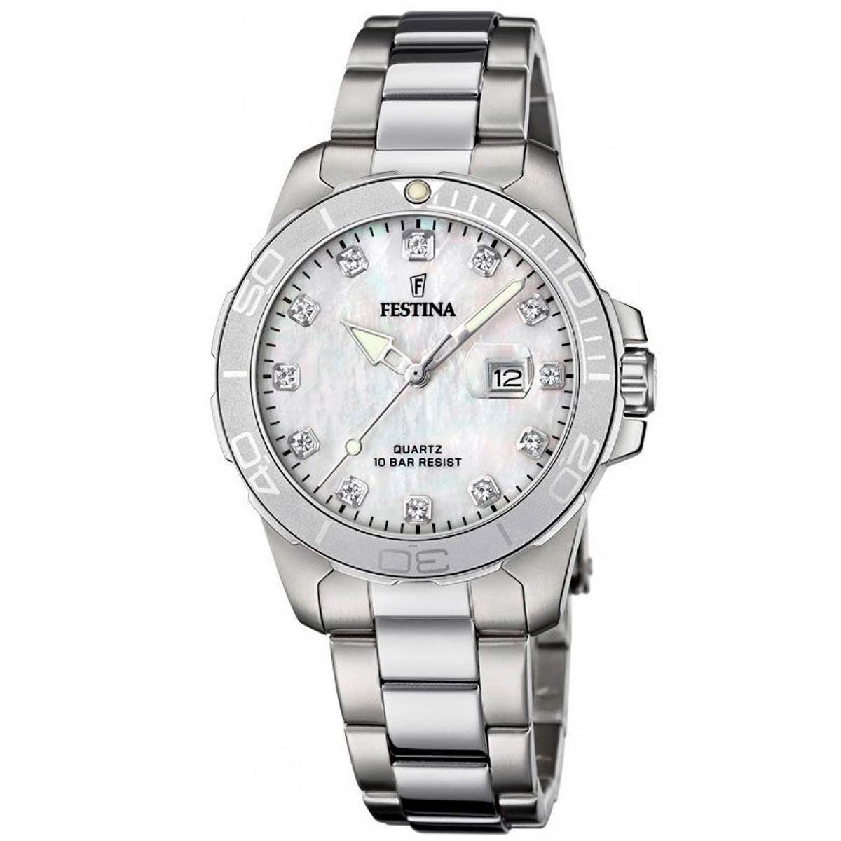 Festina F20503/1 Lady's Sport. Super lækkert dameur med tydelig urskive i perlemor, og solid lænke. Det har en vandtæthed på 10ATM, som gør uret egnet til svømning og badning. Uret har analog kvarts urværk, som betyder at urværket er af høj kvalitet og drives af et udskifteligt batteri. Bemærk venligst: Produktet kan afvige fra billedet.