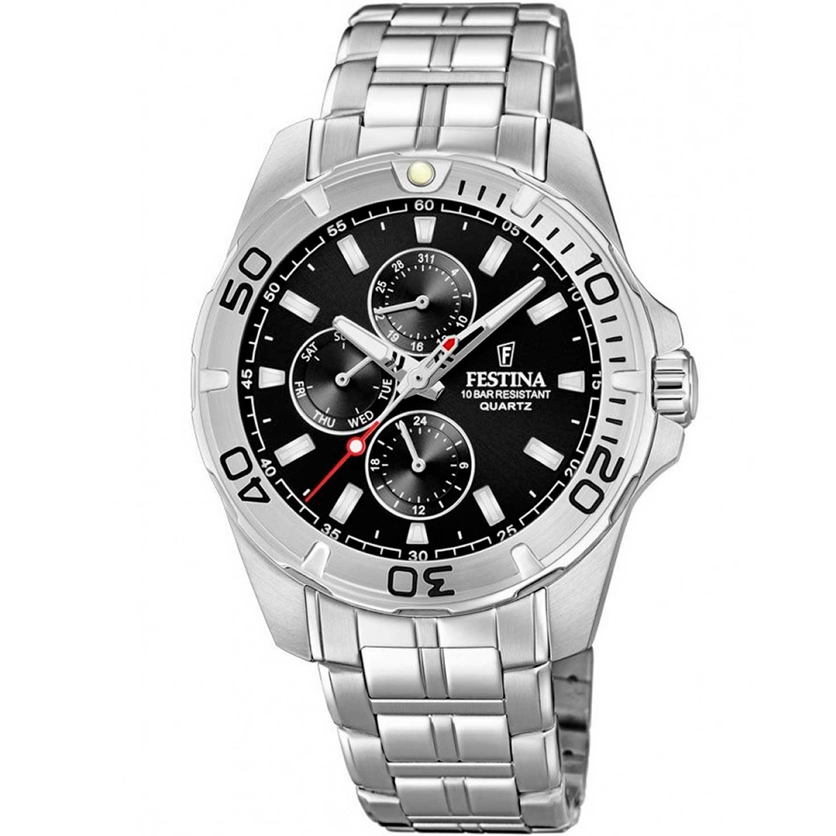 Festina F20445/3 Multifunktion. Lækkert herreur i et sporty og stilrent design. Uret er fremstillet med 43mm stålurkasse, stållænke og mineralglas. Uret er forsynet med en flot sort urskive og visere samt indekseringer der har fået flouricerende middel, så de lyser i mørket. Samdtidigt har uret multifunktion som består af dag, dato og 24 timersvisning. Festina har en vandtæthed på 10ATM, som gør det uret egnet til svømning og badning. Uret har analog kvarts urværk, som betyder at urværket er af høj kvalitet og drives af et udskifteligt batteri. Bemærk venligst: Produktet kan afvige fra billedet.