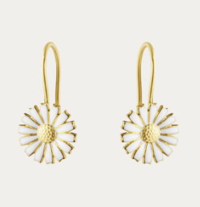 Daisy er et par elegante ørebøjler med fastmonteret marguerit vedhæng i tidsløst klassisk design. Ørebøjlerne er udformet som den danske nationalblomst; Margueritten og er fremstillet af sterlingsølv belagt med 18kt guld med hvid glasemalje som er påført hvert enkelt blomsterblad og smukt forener det rene, glade og friske udtryk.