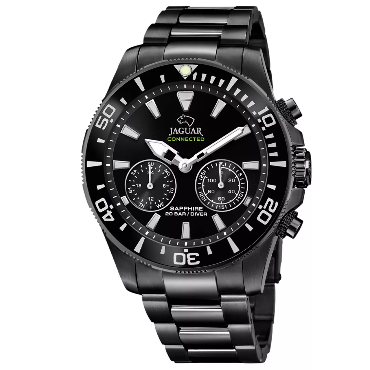 Jaguar J929/1 Hybrid/connected herreur. Super fedt sort i sort herreur. Uret er fra connected serien, hvilket betyder du skal downloade en app til din smartphone, og der skal uret connectes til. Der igennem kan du holde styr på forskellige så som skridttæller, notifikationer og sms. Det har en lækker stål lænke som er sortbelagt og både sort krans og skive. Det er tæt 20bar og har safirglas. Bemærk venligst: Produktet kan være forstørret og farveforstærket. Den sorte farve er en overflade som slides med tiden og kan påvirkes af parfume og andre kemikalier