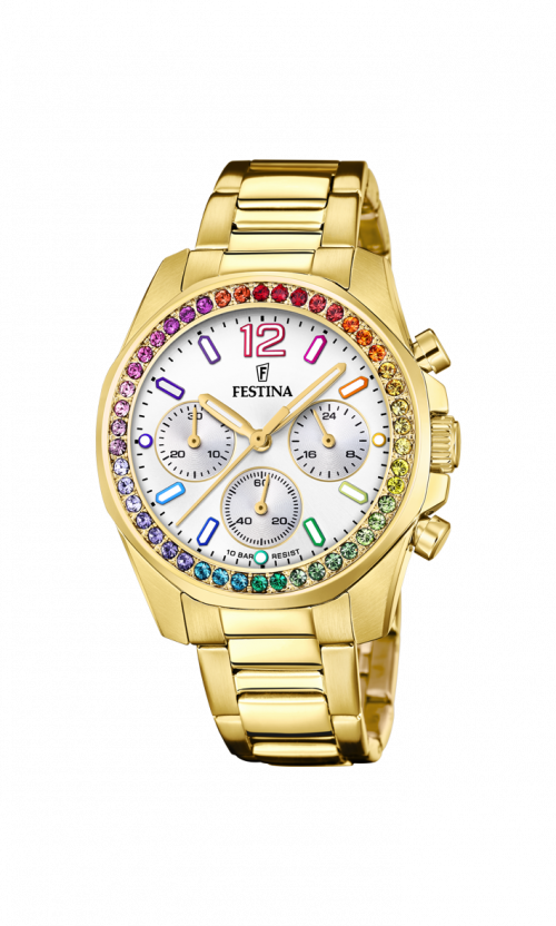 Festina F20609/2 Rainbow dameur. Super flot dameur i gulddouble med lænke, hvid skive med små chronograf skiver på. Det vilde ved dette ur er den farvegraderede krans hvor man ser alle regnbuens farver, samt markeringerne på skiven som også er farvegraderet. Sporty og frækt. Uret har mineralgals og quarts værk. Bemærk venligst: Produktet kan være forstørret og farveforstærket. Guldfarven er en overflade som slides med tiden og kan påvirkes af parfume og andre kemikalier