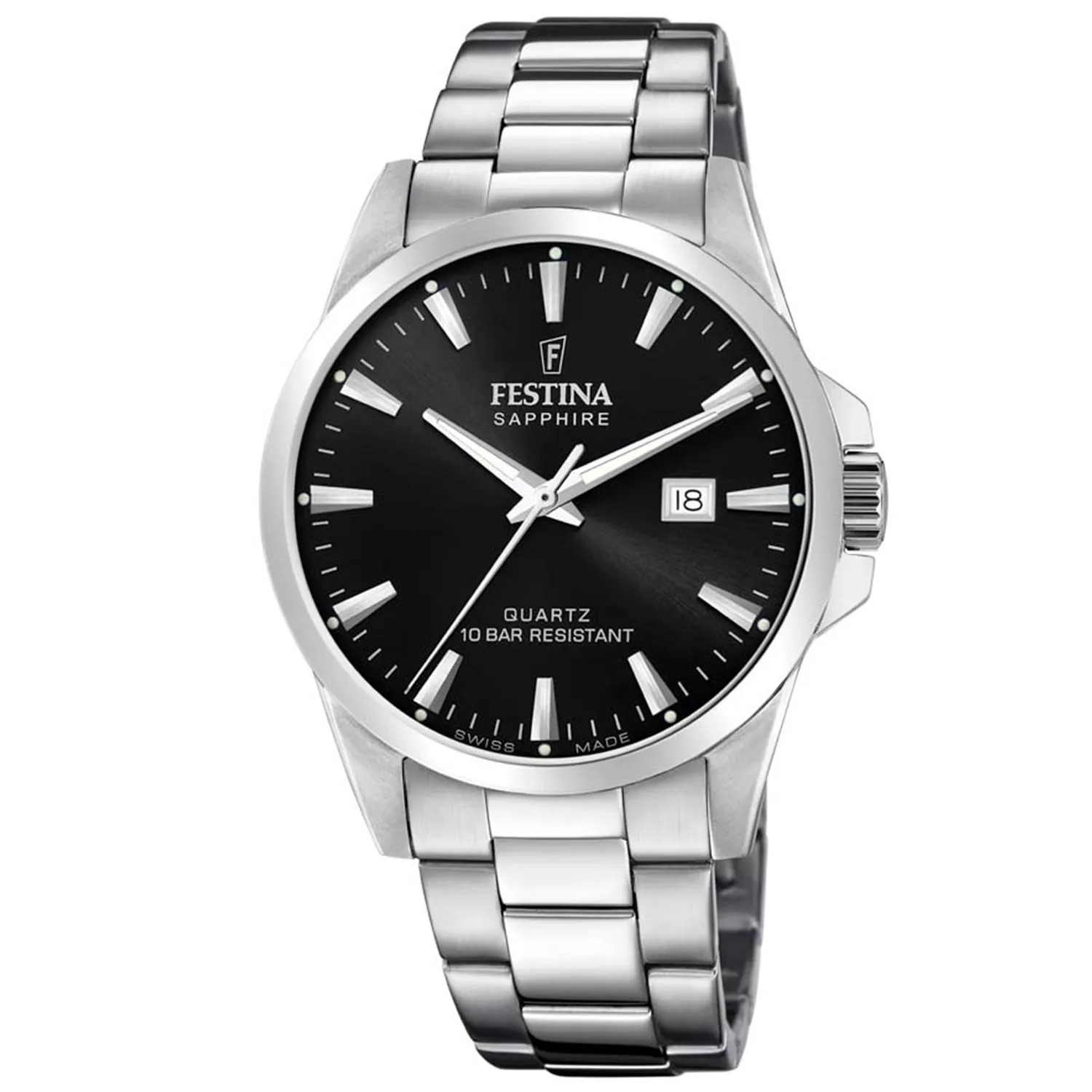 Festina F20024/4 Swiss made herreur. Helt klassisk lækkert hereur i stål med sort skive. Uret er med schweizisk urværk, safirglas, dato visning og tydelige index. Et super fint og enkelt ur. Bemærk venligst: Produktet kan være forstørret og farveforstærket.