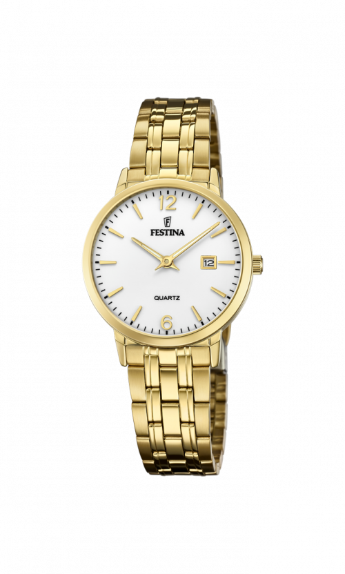 Festina F20514/2 er et enkel og stilfuld dameur i gulddouble. Uret har tydlige tal og datovisning. Det har en vandtæthed på 5ATM, som gør uret egnet til at modstå regn og vandsprøjt. Uret har analog kvarts urværk, som betyder at urværket er af høj kvalitet og drives af et udskifteligt batteri. Bemærk venligst: Produktet kan afvige fra billedet.