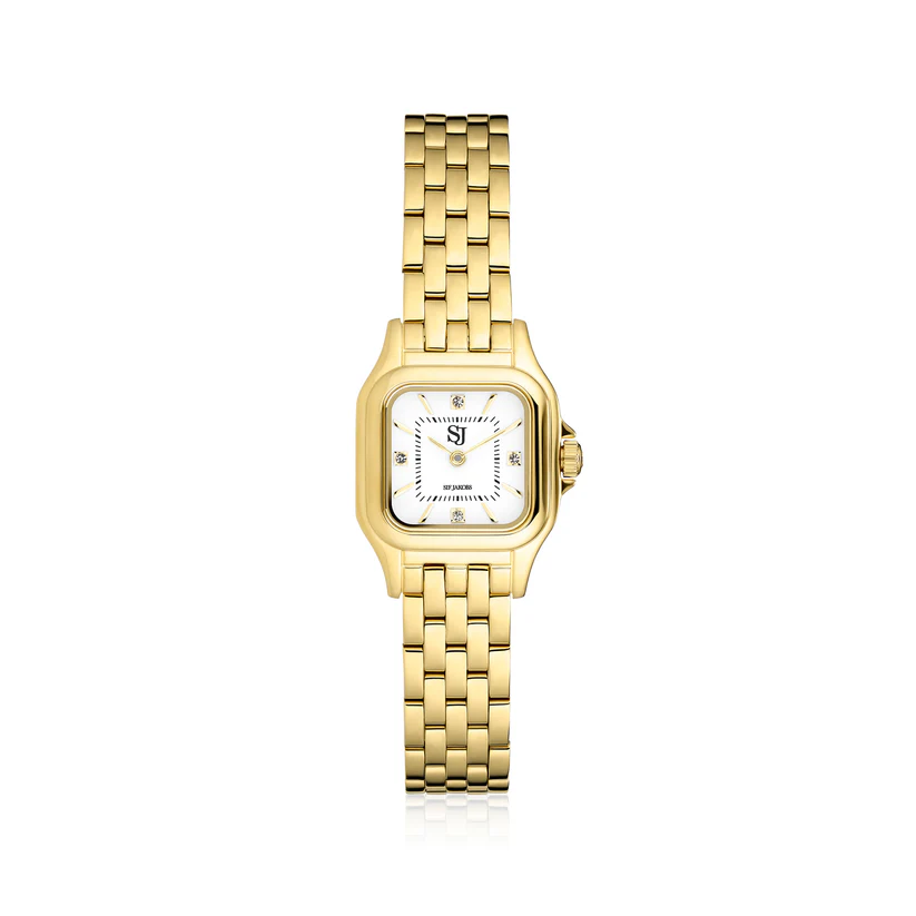 Super flot dame ur fra Sif Jakobs, med guldfarvet lænke og hvid skive.