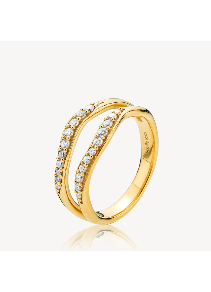 Ringen er udført i forgyldt sterlingsølv med glimtende sten i de to buer. Den er enkel, men stadig fylder den på fingere og passer perfekt til alle outfitts.
