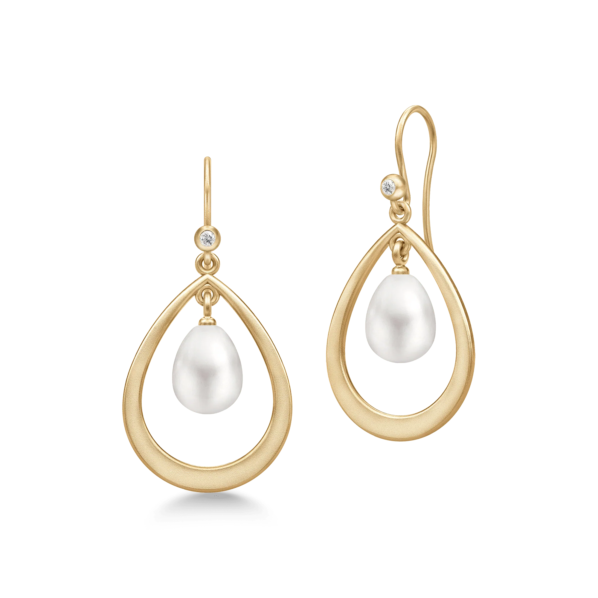 De populære Perla øreringe i 22 karat forgyldt 925 sterlingsølv med hvide ferskvandsperler og facetslebne, klare zirkoner.