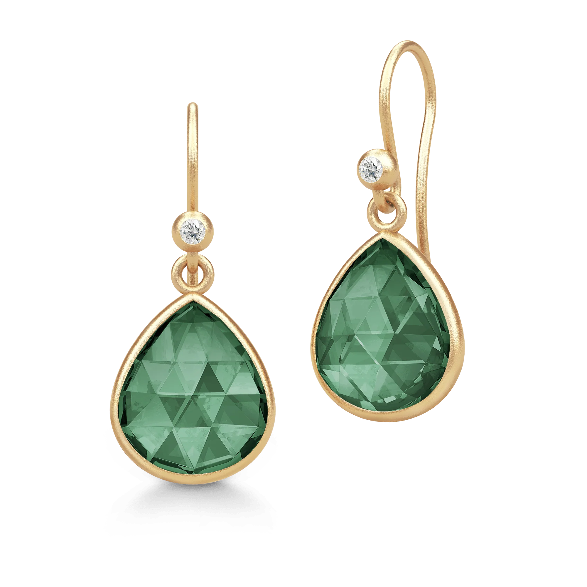 Vores Lea Earrings er fremstillet i 22 karat forgyldt 925 sterling sølv. Disse øreringe kommer med smukke farvede pear briolette rose cut krystaller, der måler 10 mm x 12 mm. Derudover er øreringen dekoreret med cubiske zirkonia. Oplev også det matchede Lea Pendant, hvis du ønsker et sammenhængende udtryk.