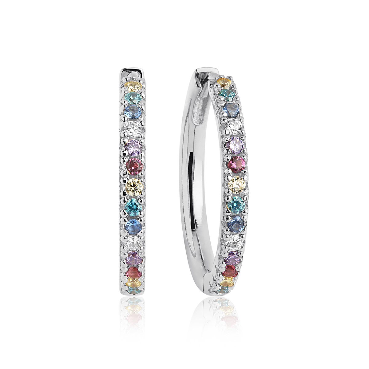 Sif Jakobs Ellera Grande øreringe. Super smukke creoler fremstillet i sterlingsølv med multi farvede zirkoner foran. Creolen er lavet med klik lukning som gør det nemt at tage dem af og på. De er perfekte til at kombinere med flere andre øreringe hvis du har flere huller i ørerne. Men er også super smukke alene. øreringene findes i flere størrelser. Bemærk venligst: Produktet kan afvige fra billedet. Mål: ø20mm bredde 2mm.