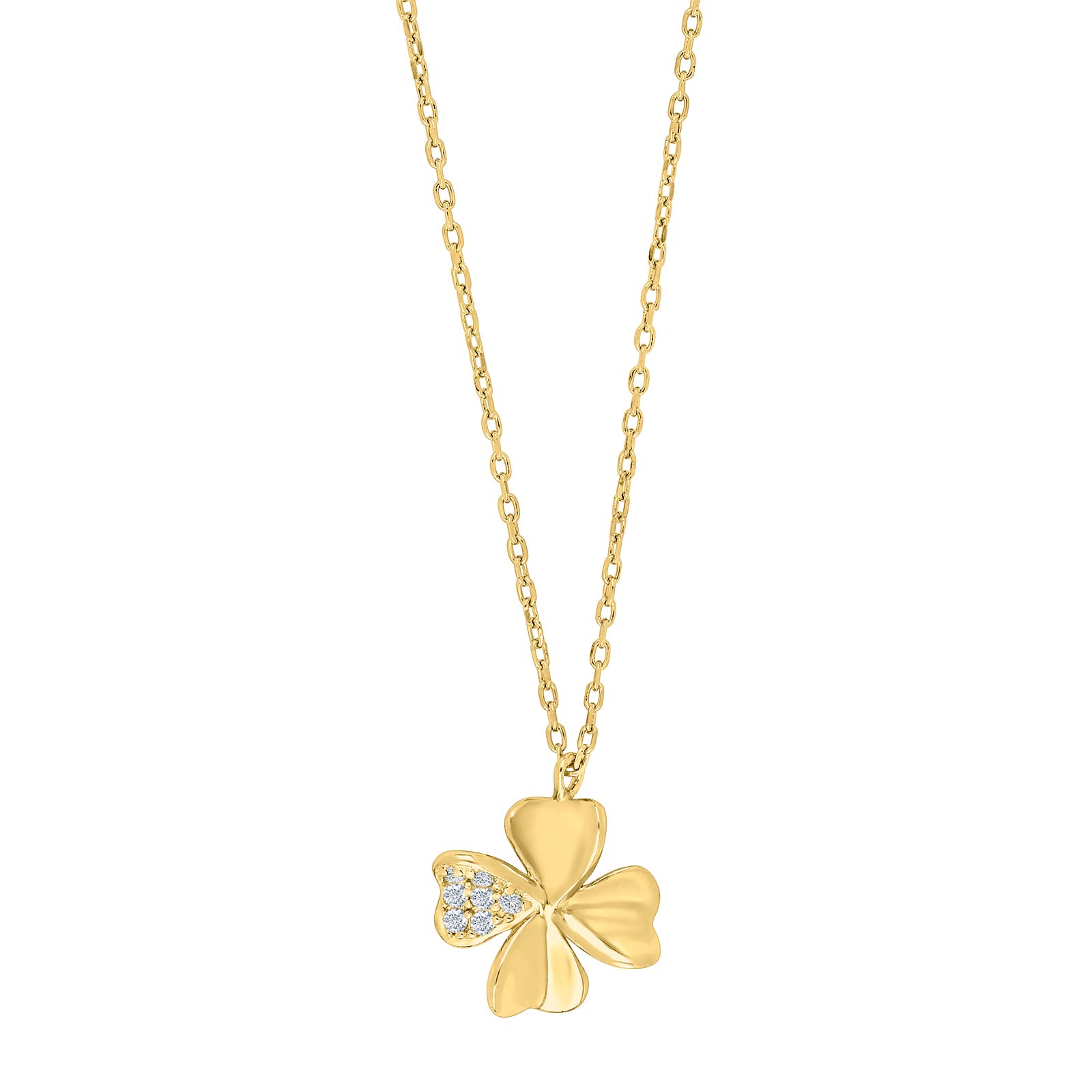 Joanlinor halskæde med firkløver vedhæng. Sød halskæde fremstilllet i forgyldt sterlingsølv med et lille firkløver vedhæng. Vedhængets ene blad er fuldt besat med glimtende zirkoner, og kæden kan justeres 42+3cm. Bemærk venligst: Produktet kan være forstørret og farveforstærket. Overfalden slides med tiden og påvirkes ved brug