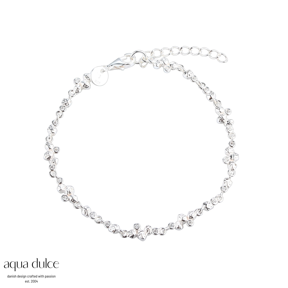 Fint armbånd med zirkonia i sterlingsølv fra Aqua Dulce. Armbåndet findes i sterlingsølv og forgyldt sterlingsølv. Det måler 17 cm + 3 cm i justerbart stykke.