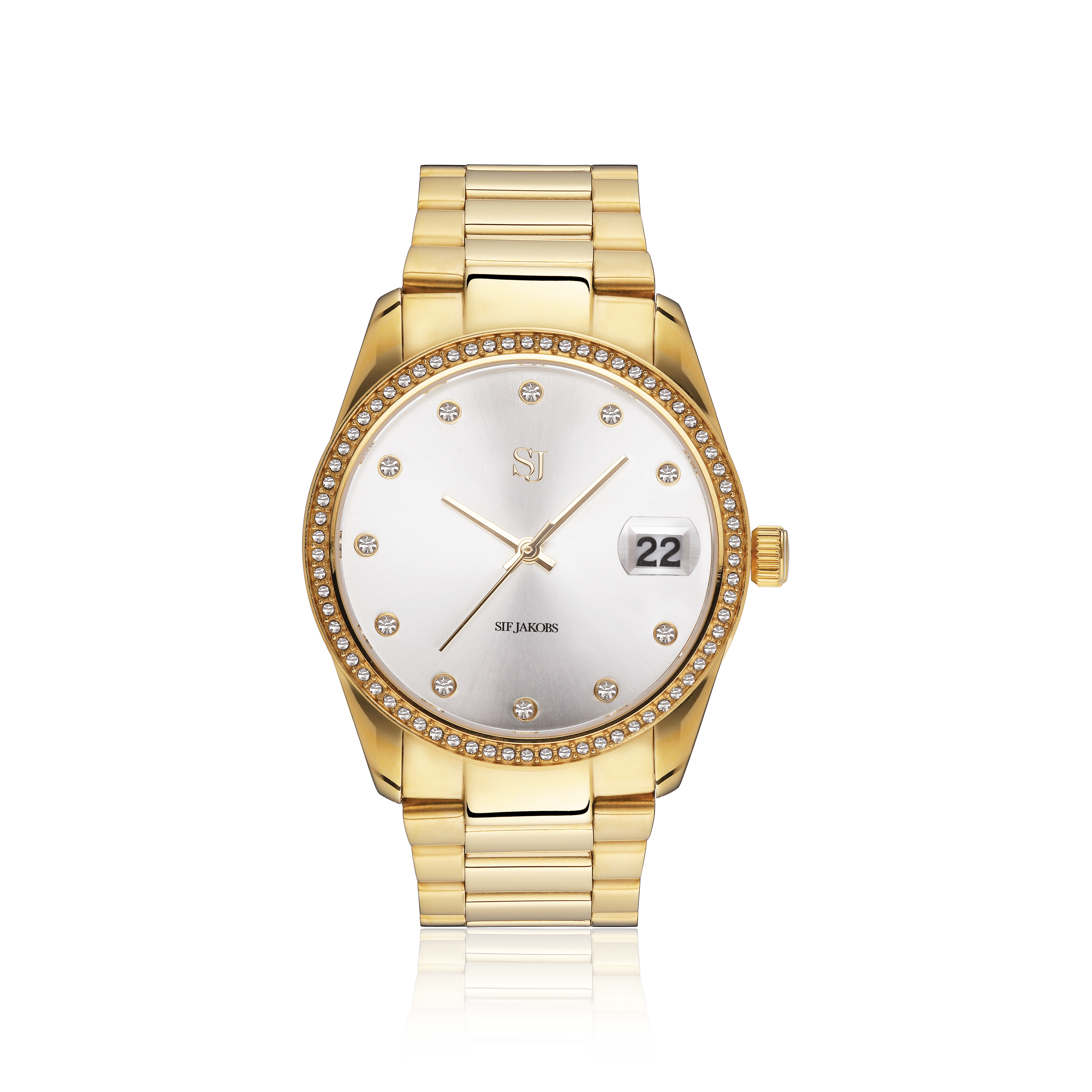 Elegant dameur udført i forgyldt rustfrit stål. Uret kommer med safir glas og forstørrelsesglas ved datoviseren. Den hvide urskive er udstyret med hvide zirkoner, som giver uret et elegant og tidsløst design. Vandtæthed er ned til 50 m. Urværket er lavet i Japan Miyota. Bemærk venligst at produktet kan afvige fra billedet.| Køn | Dame |