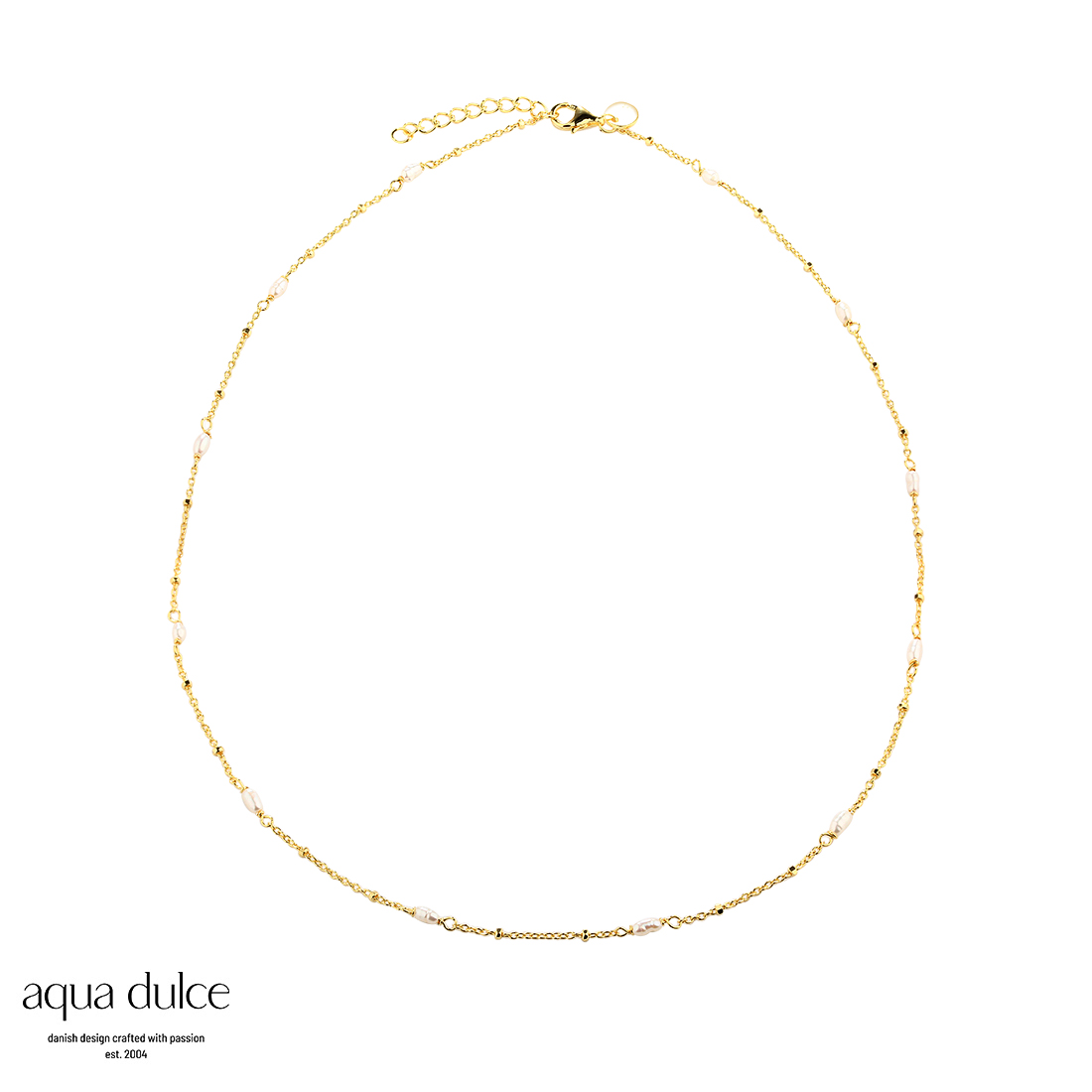 Gør hverdagen mere glamourøs med denne flotte halskæde fra Rice kollektionen. Halskæden kommer med fine risformede perler, og små vedhæng så man kan gøre den helt personlig. Halskæden kan ligeledes justeres i længden, så den sidder helt som ønsket. Størrelsen måler 42+3cm. og fås både i forgyldt sterlingsølv og sterlingsølv. Bemærk venligst at produktet kan afvige fra billedet.| Smykke type | Halskæde |