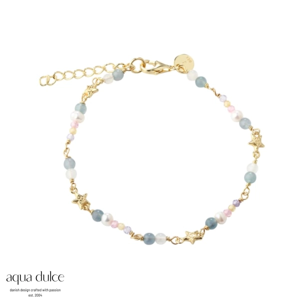 Fint armbånd fra Aqua Dulce med inspiration fra havet med søstjerner, blå sten og ferskvandsperler. Måler 17 cm + 3 cm forlængerstykke. Lavet af forgyldt sterlingsølv.