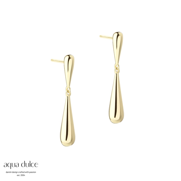 Elegante ørestikker fra Aqua Dulces Shiny Drop earstud i forgyldt sterlingsølv. Øreringene er sat sammen med et led, så den nederste del af øreringen danser i takt med hovedets bevægelse.