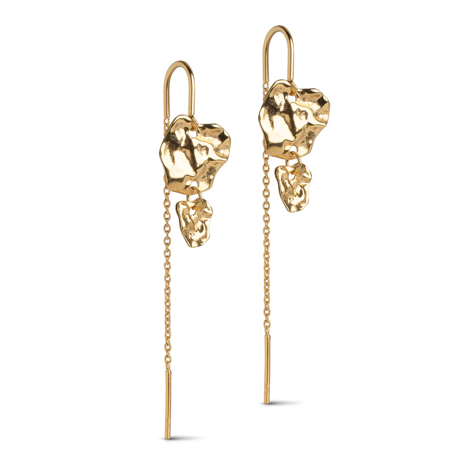 Fine øreringe fra Enamel i forgyldt sterlingsølv lavet som kædeørering, der skal trækkes igennem øret op til den lille bøjle. Øreringene bevæger sig i takt med din bevægelse - både pladerne fortil og kæden bagtil, på en dansende måde.