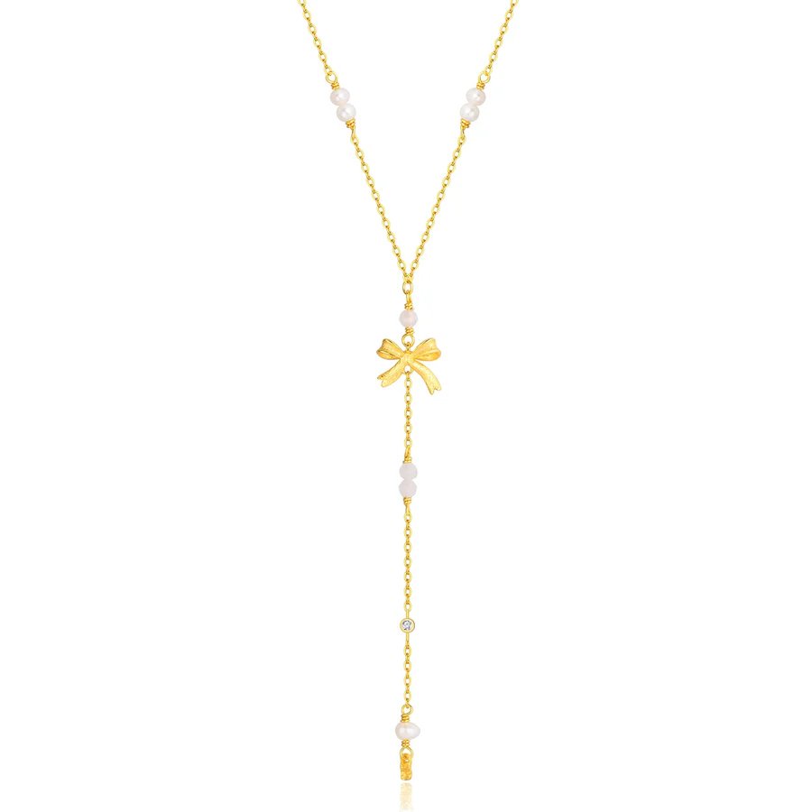 Svala halskæden er en elegant og feminin Y-halskæde i 14 karat guldbelagt sterlingsølv, pyntet med ferskvandsperler og små zirkonia sten. Den fine sløjfe-detalje giver halskæden et romantisk og yndefuldt udtryk, mens de bløde nuancer og funklende sten tilfører et strejf af lethed og charme.