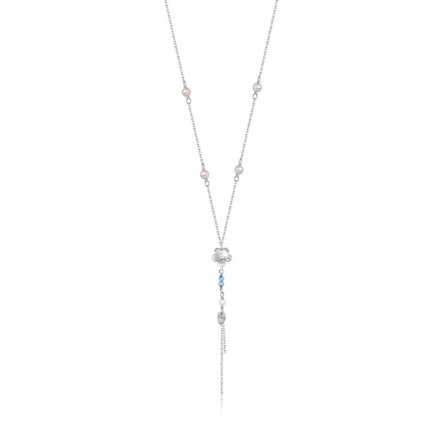 Kamila halskæden er fremstillet i S925 sterling sølv og udsmykket med blå zirkonia samt ferskvandsperler. Den fine blomsterdetalje i midten skaber et feminint og elegant fokus, mens den lange kædedetalje giver et let og legende fald. En perfekt halskæde til at pifte både hverdags- og festlooket op.