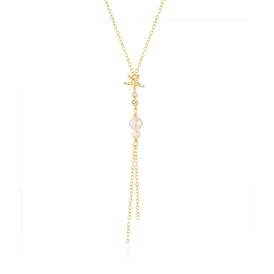 Fin Y-kæde fra Wioga i forgyldt sterlingsølv, inspireret af sommer. Kæden er pyntet med ferskvandsperler, zirkonia og en søstjerne. Halskæden passer perfekt til hverdag og til fest. Måler 42 cm + 2 cm i forlængerstykke om halsen. Kæden måler 4 cm i længden.