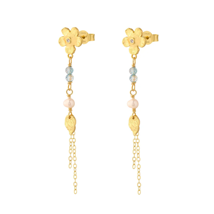 Elegante ørestikker i forgyldt sterlingsølv. Ørestikken er formet som en fin blomst med en zirkonia i midten, hvor der hænger en kæde fra med blå zirkonia, et organisk blad, ferskvandsperle og kæder. Kan bruges alene eller sættes sammen med andre øreringe for et mere personligt look.