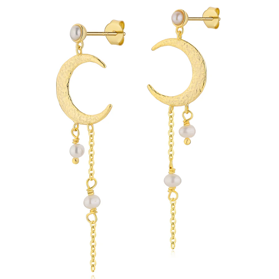 Carly øreringe fra Wioga i forgyldt sterlingsølv med ferskvandsperler, månevedhæng og kæder. Øreringene er inspireret af månens magi. Kan bruges alene eller sættes sammen med andre øreringe for et mere personligt look.