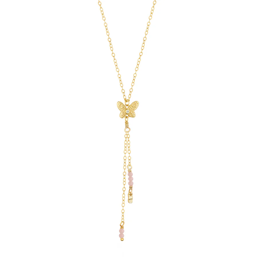 Y-kæde fra Wioga i forgyldt sterlingsølv med en fin sommerfugl med en zirkon i midten, ferskvandsperler og rosa quartz. Halskæden måler 42 cm + cm i forlængerstykke. Kæden er cm i længden. Passer til alle lejligheder.
