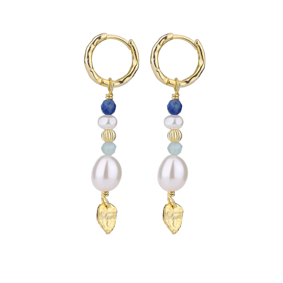 Fine øreringe fra Wioga med blå sten og ferskvandsperler. Måler 4 cm i længeden. Kan bruges alene eller sættes sammen med andre øreringe for et mere personligt look.