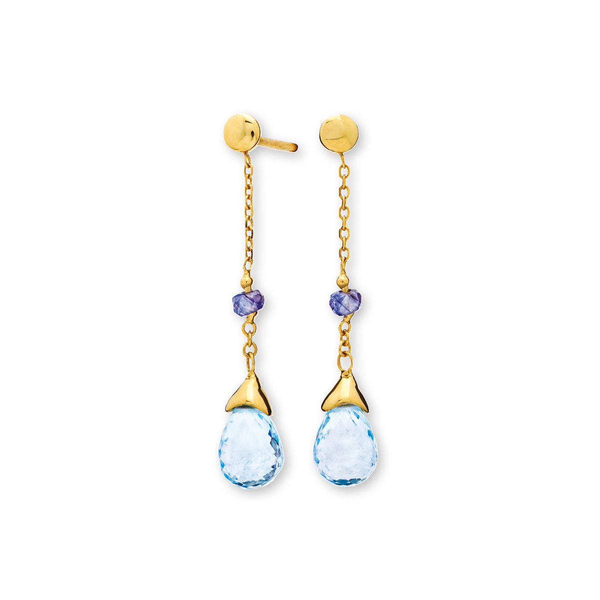 Stella Gold rødgulds ørehængere med safir og topasdråber. Enkle ørehængere fremstillet i 9kt rødguld, med en lille mørkeblå safir og en smuk facetteret topas dråbe i hver. På toppen er der en lille cirkel med ørestikken på, topas dråben hænger i en fin tynd guldkæde, og på midten sidder den lille safir. Bemærk venligst: Produktet kan være forstørret og farveforstærket