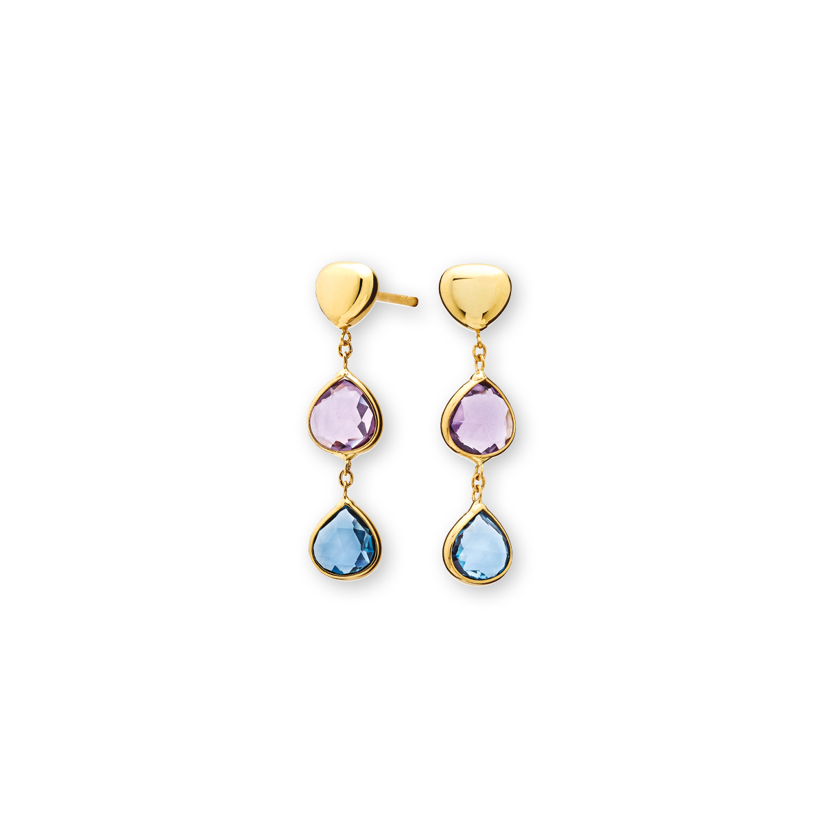 Stella Gold rødgulds ørehængere med ametysk og topas. Super smukke ørehængere med farvede sten. Fremstillet i 9kt rødguld, med en blank buttet trekant i toppen, efterfulgt af en facetteret lilla ametyst og en facetteret blå topas. Stenenes facetter glimter og spiller super flot, og når øreringen sidder på øret kan de stadig bevæge sig. Perfekt til dig der gerne vil have en lille smule farve på både hverdag og fest. Bemærk venligst: Produktet kan være forstørret og farveforstærket