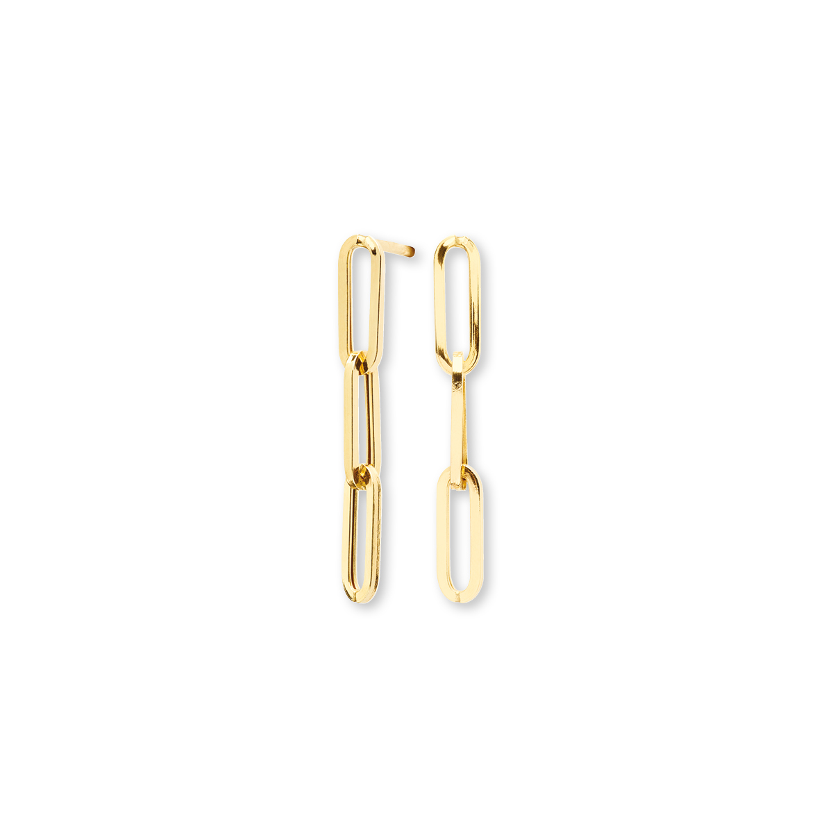 Stella Gold rødgulds ørehængere. Super enkle ørehængere fremstillet i 9kt rødguld, udformet som 3 ovale led med stikken i det øverste led og de to andre led hængende nedenunder. For et chunky men alligevel let look. Bemærk venligst: Produkete kan være forstørret og farvetforstærket