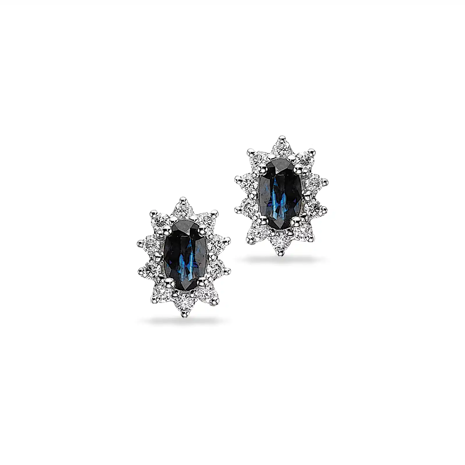 Roset øreringe fremstillet af 14kt hvidguld med en blå safir der er smukt omkranset af hvide funklende brillanter i Wesselton/Si kvalitet.