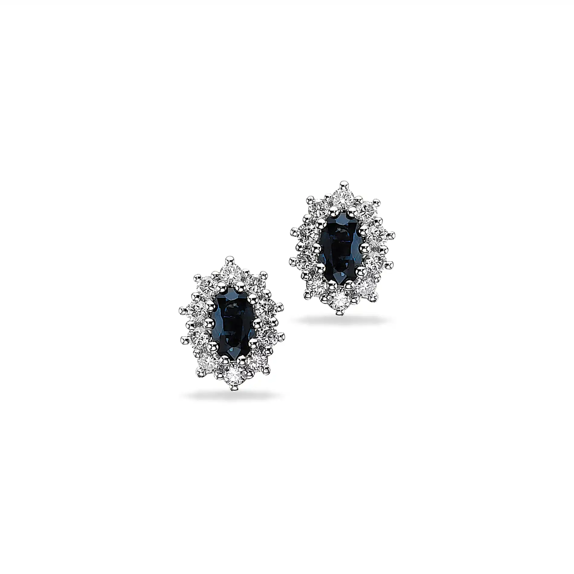 Roset øreringe fremstillet af 14kt hvidguld med en blå safir der er smukt omkranset af hvide funklende brillanter i Wesselton/Si kvalitet.